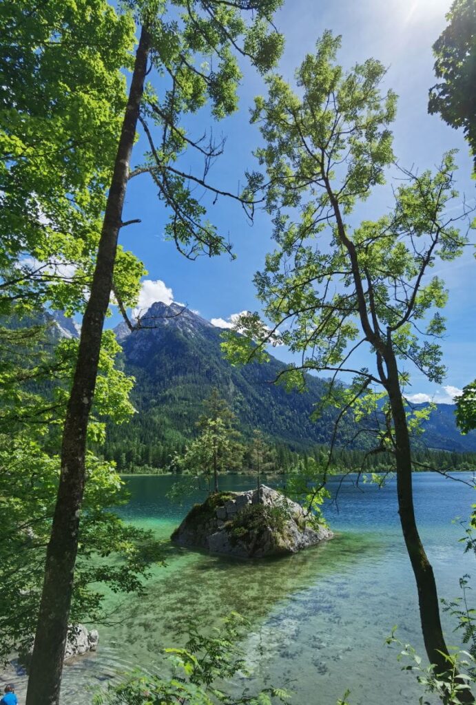 Der Hintersee ist für uns das wahre Juwel von Ramsau. Der Bergsee wird überragt vom Hochkalter und hat glasklares Wasser. Es schimmert in der Sonne türkisgrün und bildet am Nordufer magische Buchten aus. Nicht umsonst befindet sich hier auch der Libelingsplatz von König Luitpold von Bayern. Die besondere Schönheit lockte auch viele Maler an den Hintersee. Deswegen gibt es einen Themenweg über die Maler des 19. Jahrhundert. Er führt ein Stück am See entlang. Achtung: Verwechsle den Ramsauer Malerweg nicht mit dem Malerweg in der Sächsischen Schweiz. Insgesamt wurden zwischen Ramsau und dem Hirschbichlpass 26 Tafeln entlang des Malerwegs aufgestellt. Uns war der Themenweg nicht so wichtig, wir haben einfach die grandiose Landschaft genossen. Der Hintersee Rundweg führt auf rund 2,5 Kilometer einmal rund um den gesamten See. Auf der ca. 1 stündigen Wanderung wirst du begeistert von ganz vielen unterschiedlichen Ausblicken auf die herrliche Landschaft. Im Winter gefriert der Hintersee übrigens zu und wird dann zur atemberaubenden Kulisse für das Eisstockschießen auf Natureis.
