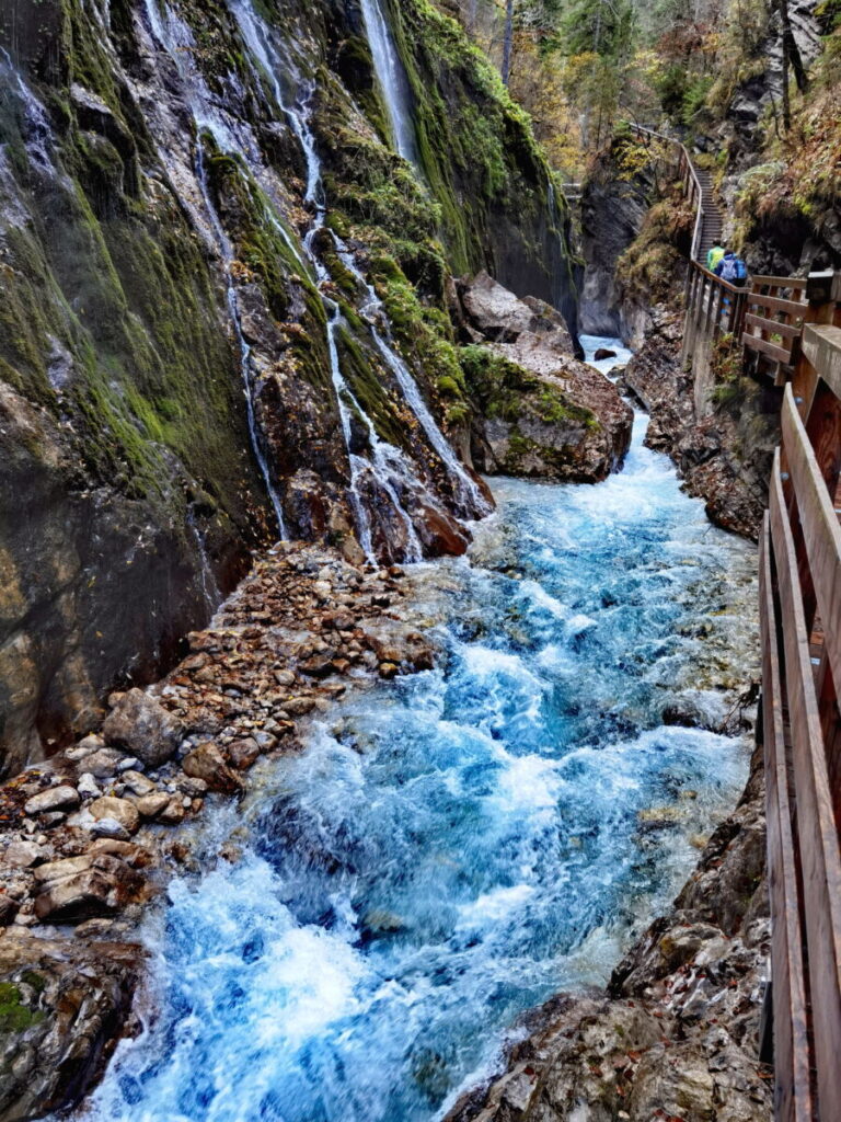 Die Wimbachklamm ist ein beeindruckendes Naturwunder geschaffen durch die reißende Kraft des Wassers des Wimbachs. Sie befindet sich am Eingang ins Wimbachtal und somit sehr gut erreichbar – auch für einen Ausflug ohne lange Wanderung. Trotz ihrer vergleichsweise geringen Länge von nur etwa 200 Metern (sie ist eine der kürzesten Klammen in Bayern) mußt du jedoch einen Eintritt bezahlen. Sehenswert ist die Klamm jedoch. Durch die zahlreichen Zuflüsse und die spektakulären Wasserfälle, die über die meterhohen Felswände hinunterfließen ergeben sich tolle Perspektiven für Fotos. Entlang der Klamm fließt nicht nur das Wasser vom Wimbach selbst, es kommt auch von zahlreichen kleinen Bächen über die Felswände herunter. Es entsteht der beeindruckende Eindruck, als würde ein einziger, langer Wasserfall in mehreren Rinnsalen die Felswand hinabstürzen. Tatsächlich sind es jedoch viele kleine, individuelle Bäche, die ein faszinierendes Naturschauspiel in der Wimbachklamm entstehen lassen.